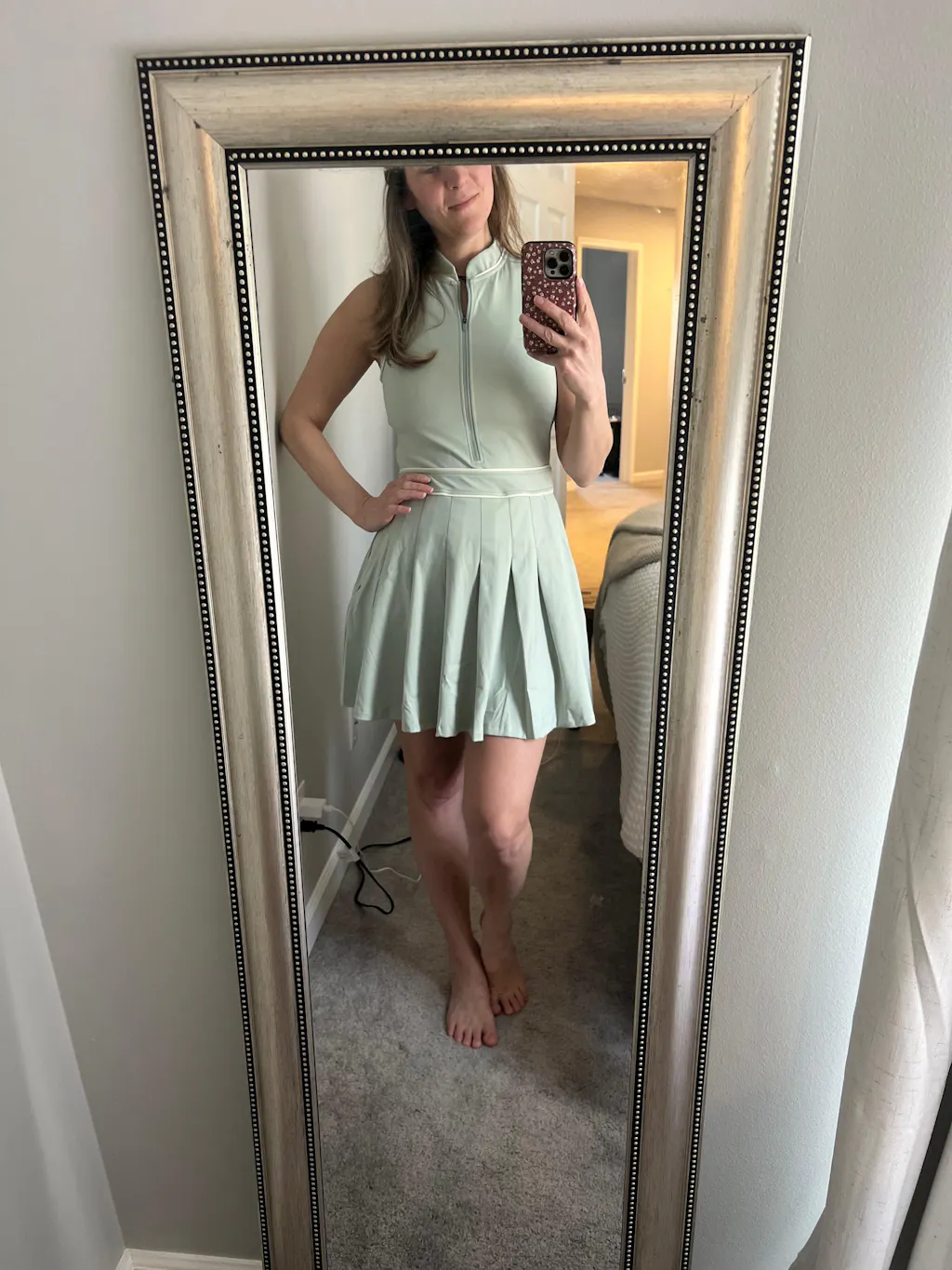 The Tate Dress is a polished fit-and-flare athletic dress crafted from our signature brushed UPF 50+ fabric. Designed with a zip mock-neck collar and contrast piping, it delivers structure with a feminine shape. Built-in liner shorts with pockets detach at the back for easy wear, while an exterior zip pocket and hidden back zipper add functional detail. Effortlessly chic for on and off the course.